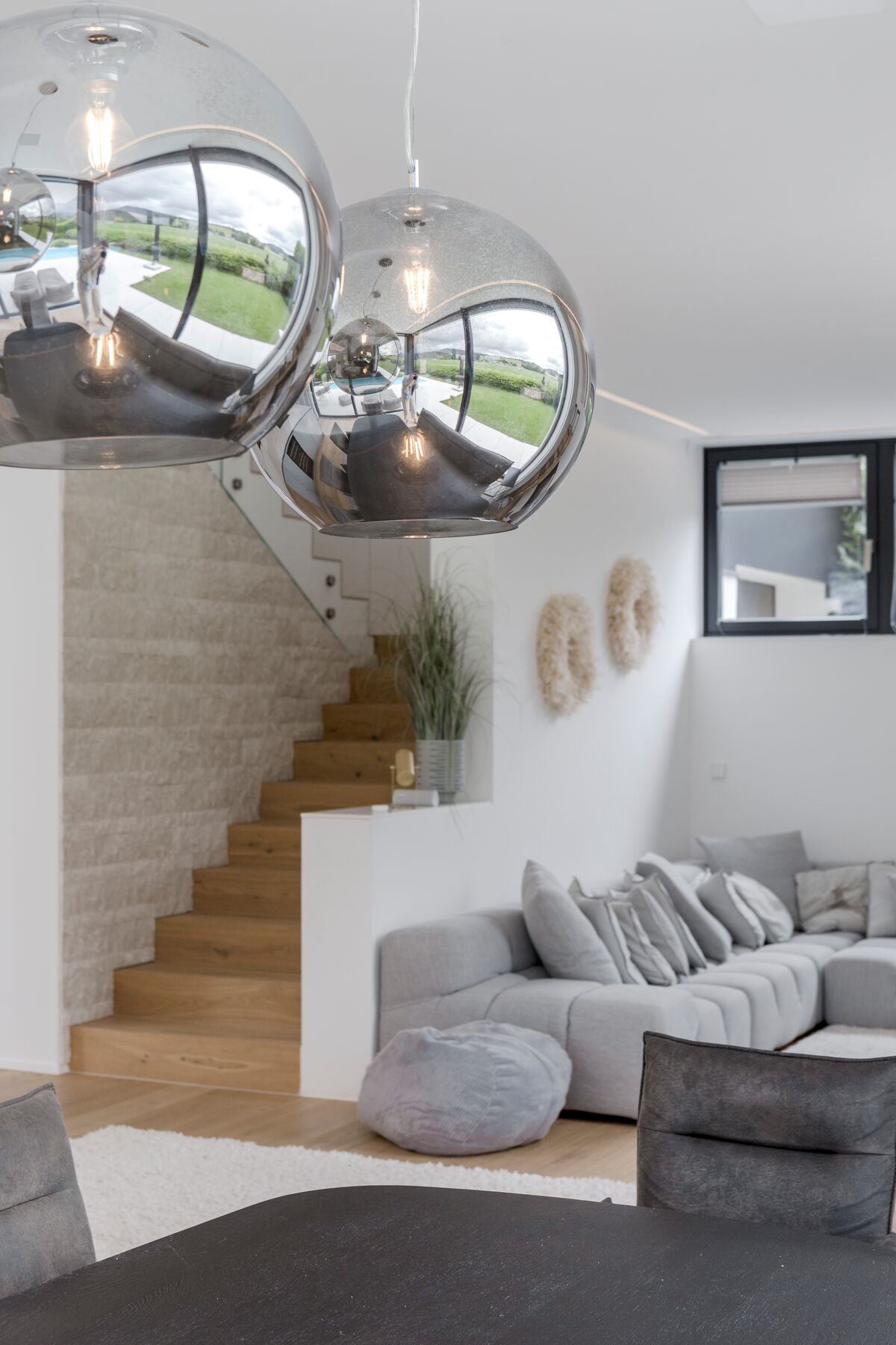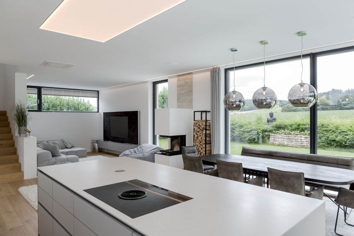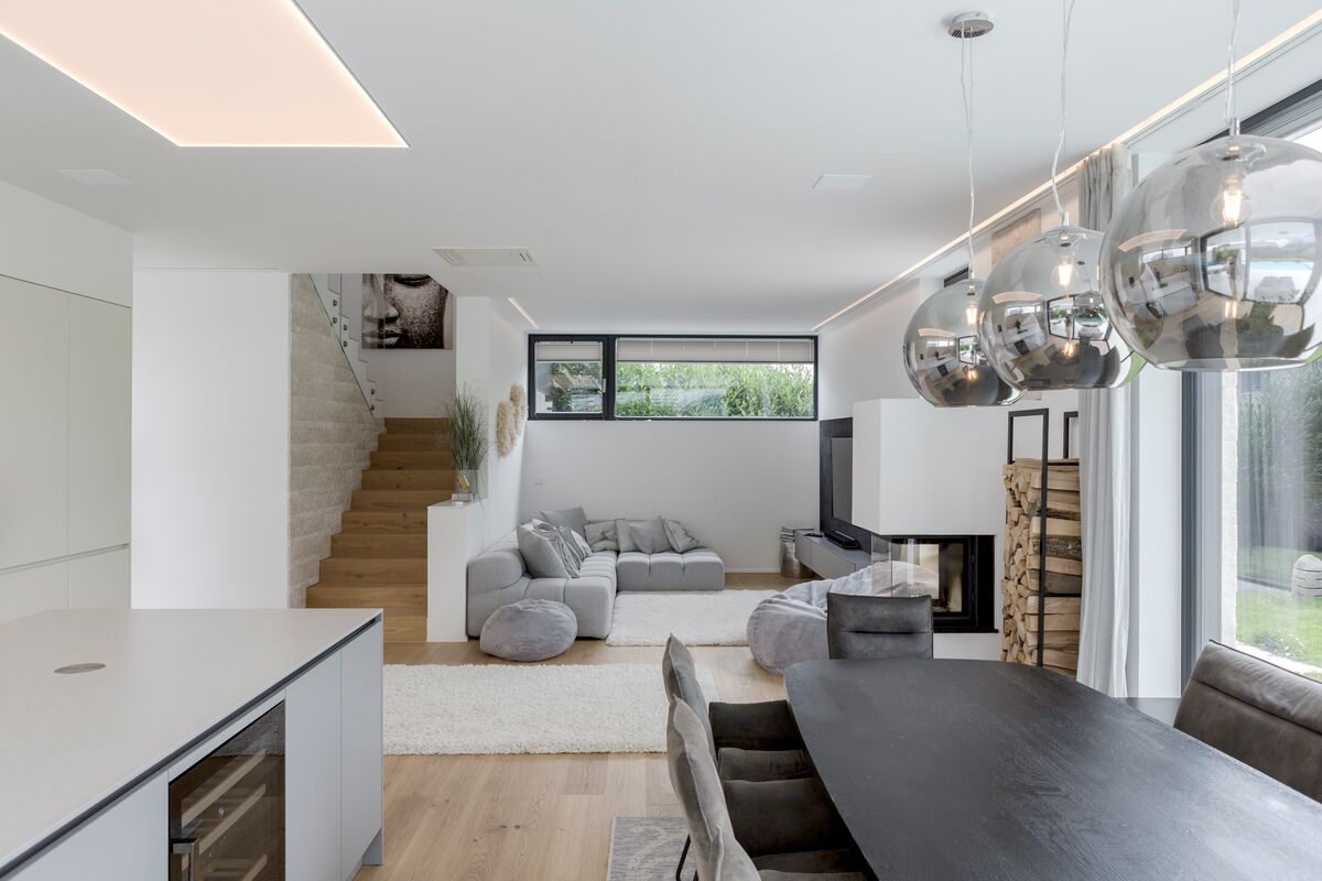 Ein offener Wohnraum mit großzügigen Glasflächen, viel Tageslicht und einer Architektur, die förmlich nach einer sanften, aber wirkungsvollen Lichtführung ruft. Unsere Aufgabe: Licht, das Atmosphäre schafft, ohne die Klarheit des Raums zu verlieren.